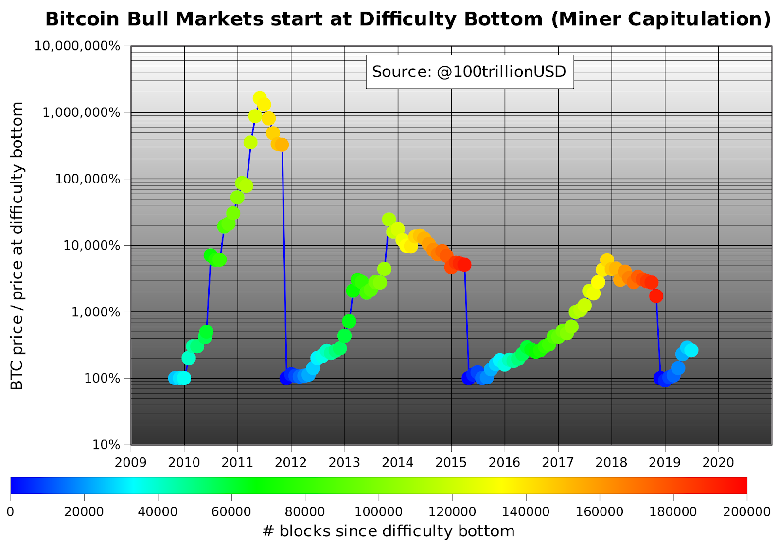 在过去的十年中,每次比特币挖矿难度达到最低点时,都会出现一次大牛市。上图可以看到,分别在2012年初,2015年二季度和2018年底达到最低点。